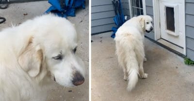 Kvinna möter hundens ledsna ögon i rostiga hålet i marken