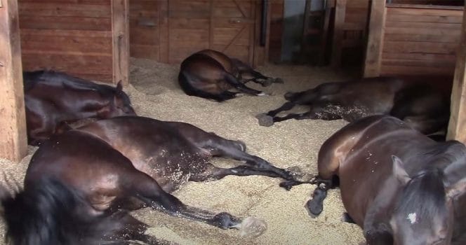 I klippet får vi möta flera fredliga och härligt sömniga hästar. De lättar väder och snarkar om vartannat. Och det hela är förstås mycket underhållande men framför allt härligt!