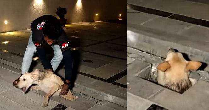 Hunden hade sökt sig till ett hål i gatan och verkade sitta fast – men det gjorde han inte, skriver den indiska djurskyddsorganisationen Animal Aid Unlimited på sin hemsida.