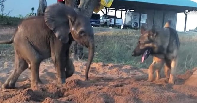 För på plats mötte elefantungen en ny kompis. Den snälla hunden ville gärna busa med den lilla elefanten och bilderna på dem båda har visats miljontals gånger. Det är lika sött varje gång!