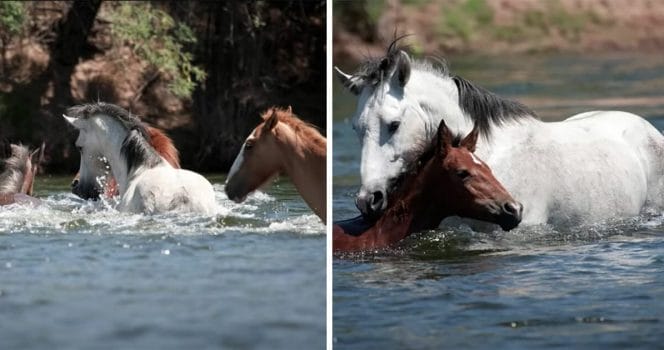 Trots att vattnet i floden var strömt började hästarna traska. Men halvvägs tappar ett föl fotfästet och sveptes med i strömmen.