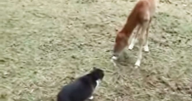 Klippet har genom åren fått hundratusentals visningar på Youtube och det är inte svårt att förstå varför. Grannkatten var nyfiken på nytillskottet i hagen, det unga fölet, och bestämde sig därför att gå närmare.