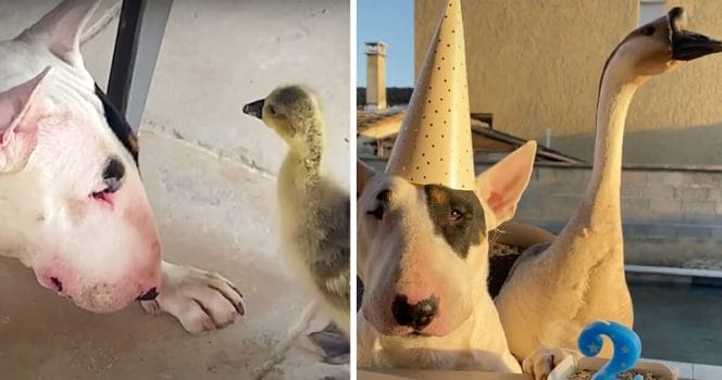 De var oroliga över hur det skulle gå att introducera den lilla gåsen för deras bullterrier, Nino.