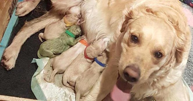 Ägarna trodde inte sina ögon när de såg att en av valparna vad grön i pälsen.