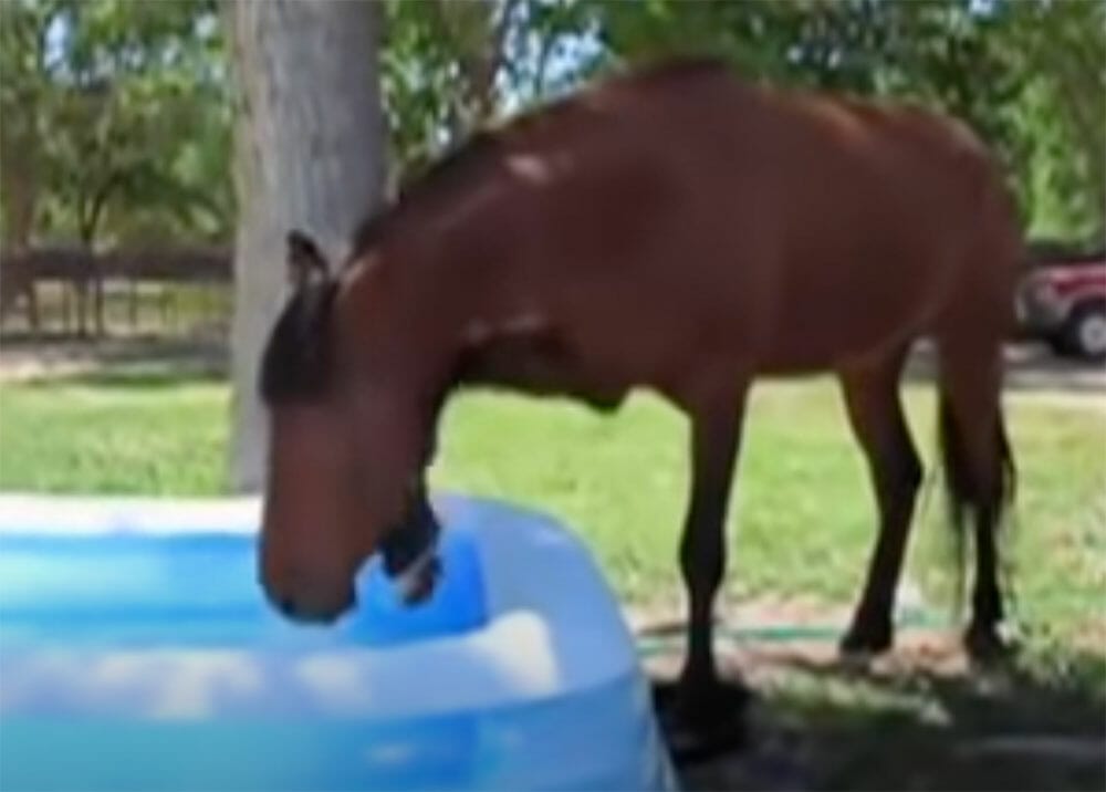 Först kan vi se hur hästen upptäcker att poolen står alldeles intill. Djuret tvekar inte lång tid – för snart befinner sig bjässen i vattnet.