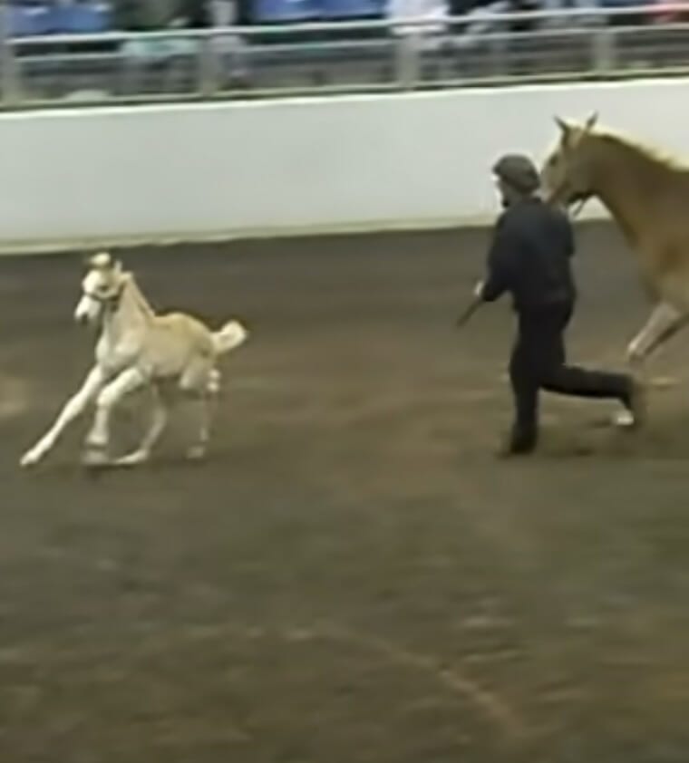 Snart får hela publiken nämligen se hur fölet hoppar och skuttar som om det vore första gången han överhuvudtaget är ute på öppet fält!
