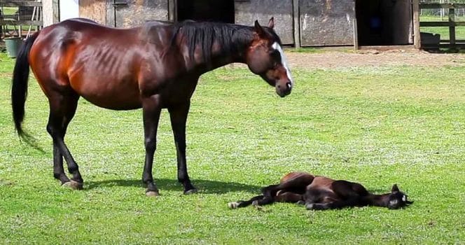Hästmamman försöker och försöker, men får till en början inget gensvar. Fölet sover djupt men hästen ger sig in i första taget. Så hon fortsätter att försöka väcka minstingen. Och efter ett tag ger det resultat.