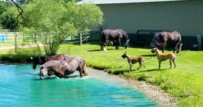 De två Grand danois-hundarna verkar bli fascinerade av hur de eleganta djuren hade roligt i dammen. Här, på Friesdale Horses, kan hästarna vandra mellan bete och vattenlek.