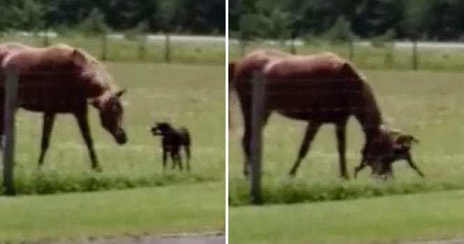 Hunden tar med en morot till hästen – nu sprids klippet med bjässens reaktion som en löpeld på nätet