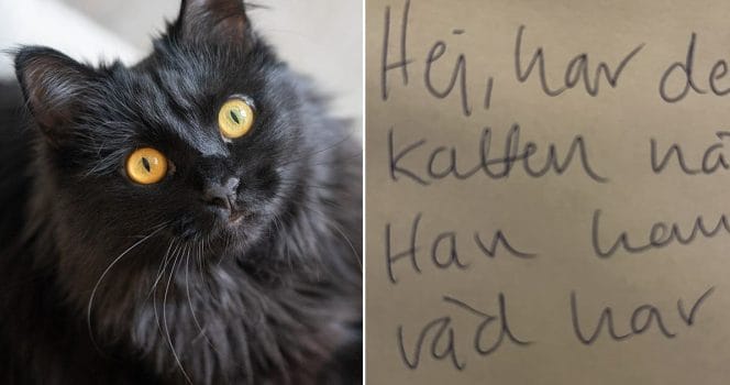 När katten Jeffrey kom hem med en handskriven lapp runt halsen blev ägaren Jessica Cowan förskräckt.