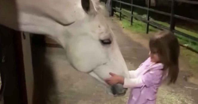 Det här fina mötet utspelade sig i Sky High Equestrian Center i Texas, USA. Tack och lov var mamman i närheten – och kunde fånga det fina mötet med sin kamera. Flickan är inte särskilt rädd för det stora djuret, och det hela förvandlas snabbt till ett möte som värmer alla hjärtan. Vi kan också se att det är flera vuxna med och ser att allt går rätt till.