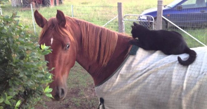 Katten tillåts hoppa upp på hästens rygg och får sedan sig en härlig åktur.