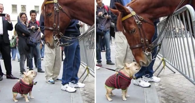 Den gulliga hunden var mycket fascinerad av den stora hästen. Han verkar både vara lite rädd men samtidigt vill han ändå leka och hoppade glatt.
