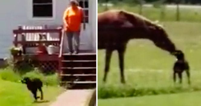 Även den här hunden och hästen, som vi tyvärr inte lyckats hitta några namn på, verkar vara riktigt goda vänner. Hästens reaktion när han får moroten av hunden är bara underbar – se klippet nedan.