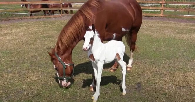 Coconuts färg är tovero, skriver ranchen på Youtube, och färgen är en blandning av tobiano och överfärgningar i Pinto-hästar och amerikanska hästar.