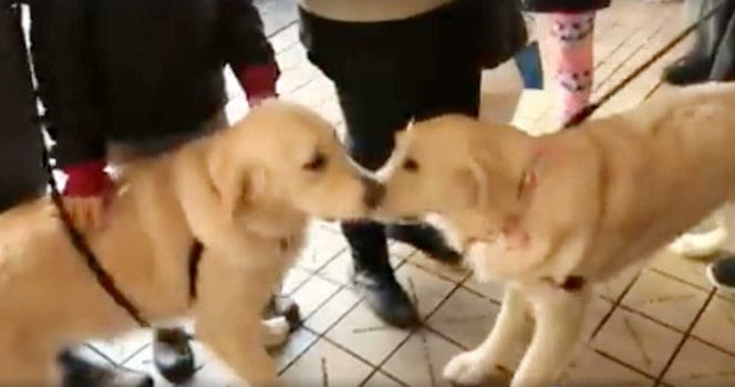 2 främmande hundar rusar mot varandra i affären, då tittar ägarna i deras öron och inser sanningen