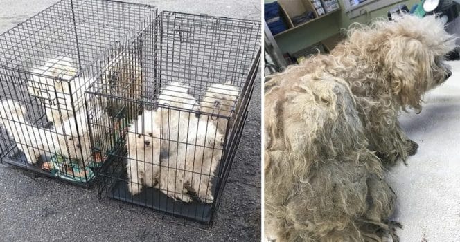 Fördelat på de två burarna satt nio små hundar av rasen bichon frise. De var alla i mycket dåligt skick och hade blivit vanvårdade under lång tid.