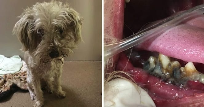 Det måste ha varit väldigt smärtsamt för den stackars lilla hunden. Det visade sig att tänderna var riktigt dåligt skötta, och veterinären beslutade att det var bäst för honom om de tog ut tänderna som var dåliga. Det slutade med att de plockade bort 21 tänder ur den lilla stackarens mun.