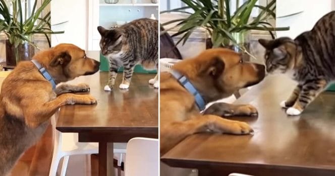 Härliga återföreningen mellan hunden och katten fångas på bild