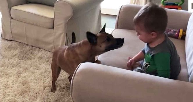 Hunden Brooklyn tycker verkligen om Andonis, det märks när man tittar på videon som pappa har filmat. Han rusar upp till den lille pojken – och sen tillbaka. Och tillbaka, och tillbaka! Titta nu på pojkens och hundens underbara reaktion och samspel! Samtidigt som det är viktigt att poängtera med säkerheten för små barn. Förhoppningsvis hade pappan full koll på detta då han var i samma rum och övervakade det hela.