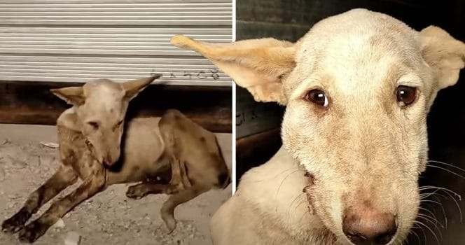 Den här hunden hittades med två sår vid munnen som fick hans utseende att drastiskt förändrats från det ursprungliga.