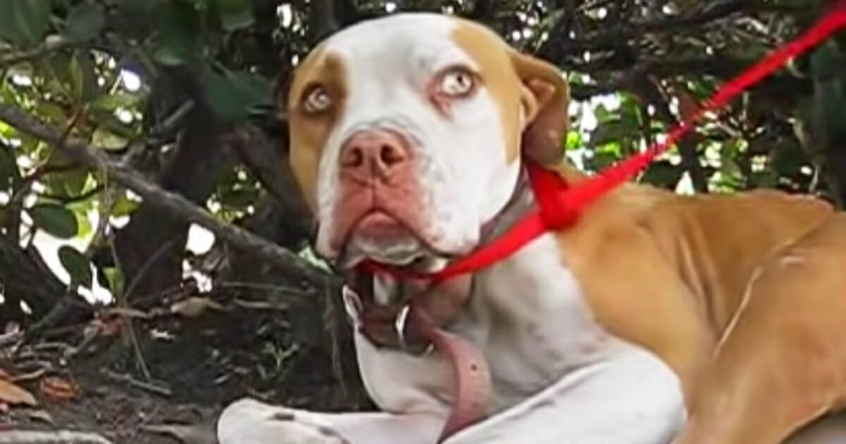 Ensam och blyg. Pitbullen som heter Karma hittades under en buske nära en väg i Long Beach, Kalifornien. Det var djurskyddsorganisationen Hope for paws som fick höra att hon fanns där, och de åkte dit.