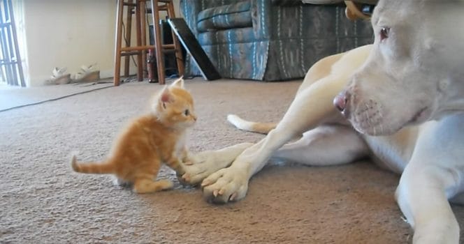 Det får vi bevis på i denna söta video som visar ett kärleksfullt första möte mellan en kattunge och en hund av rasen pitbull. Pitbull kan i mångas ögon uppfattas som en aggressiv hund. Men det motbevisas fullkomligt i videon.