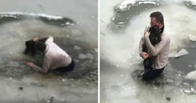 Djurhjälte kastar sig ner i iskalla vattnet – för att rädda hunden från att drunkna