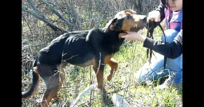 Mitt ute i ingenstans såg hon en hund som var i fruktansvärt dåligt skick. Hunden var kraftigt undernärd och gick på tre ben. Hon misstänkte att han hade brutit ena frambenet.