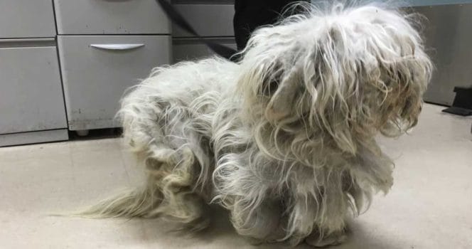 När hunden Silky kom in till veterinären såg hon mer ut som en golvmopp än en hund. Pälsen var bara tovor, i den hängde det stora smutsklumpar och hon kunde inte ens se.