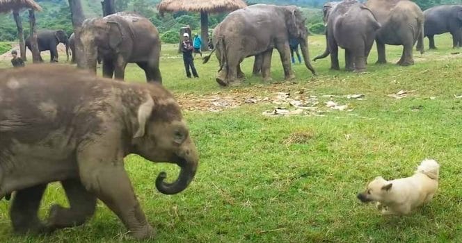 Samtidigt är den lurvige, fyrbente vännen på lekhumör. Och det visar sig att elefantungen går i samma tankar. Därefter börjar en härlig lek där elefanten jagar den busige vovven.