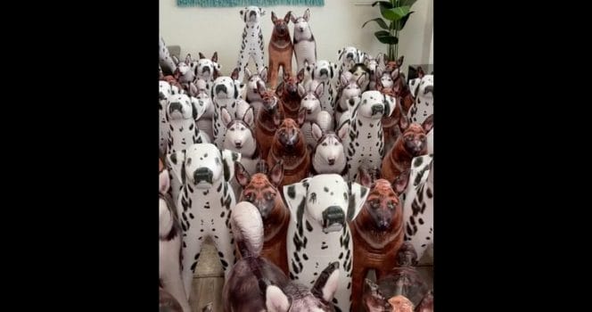 Dels är det en härlig bild på massor av hundar – men den förvirrar också väldigt många tittare. Det visar sig nämligen att flera har problem att identifiera var den enda verkliga hunden Sky i bilden gömmer sig. Han är dessutom väldigt duktig. Bilden är egentligen ett videoklipp, och det är tydligt hur hunden står blickstilla och rör inte en min, bredvid de andra hundarna som alltså är leksaksvovvar.