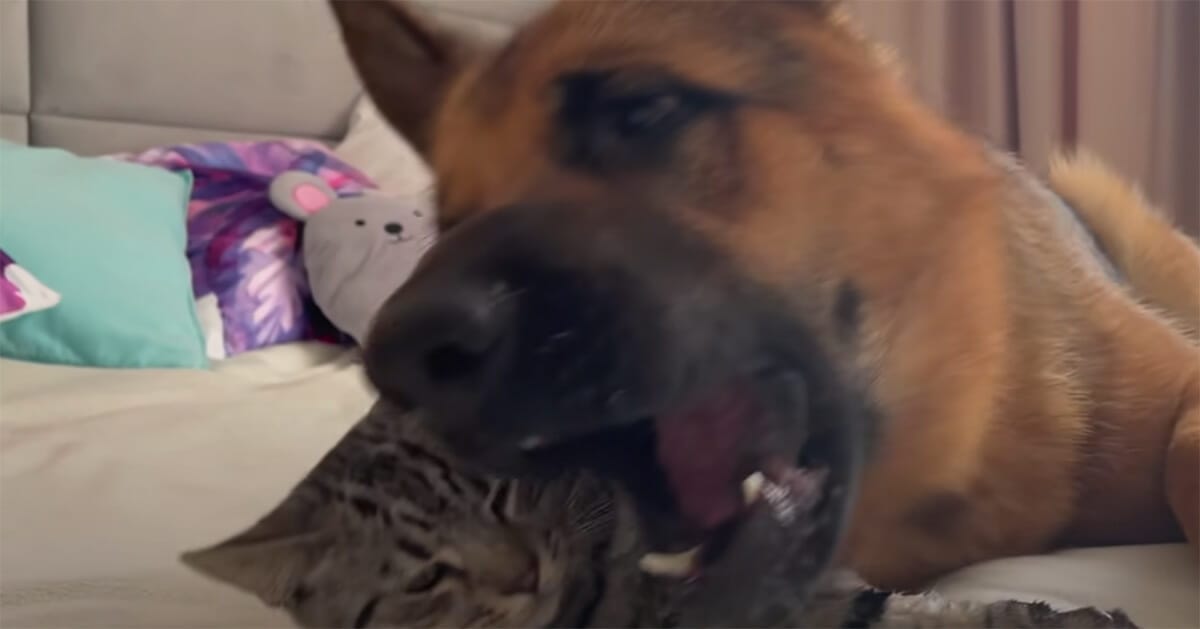 Katten ignorerar den stora schäferns initiativ till lek. Den stora bjässens nästa drag får djurvänner att kippa efter andan.