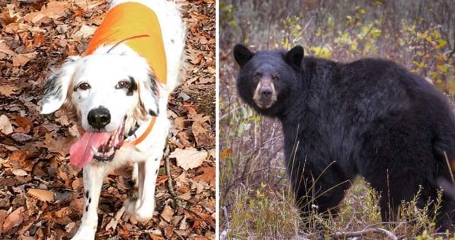 Hunden Pete var ute i skogen med sin ägare och familjens andra hundar när de plötsligt hamnade öga mot öga med en stor björn.