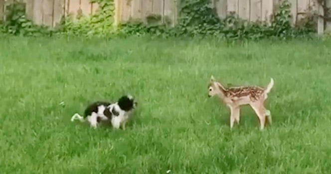 När familjen såg vad som hände skyndade de sig att ta upp kameran för att fånga djurens möte på film. Här nedan kan du se videon!