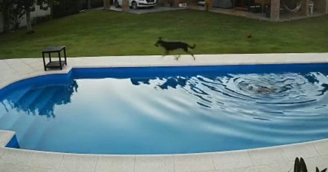 Just den här dagen hade Luna ramlat rakt ner i poolen – då kom Caipirinha till undsättning. Hon insåg att den äldre hunden inte kunde komma upp själv, och bilderna på övervakningskameran visar nu hennes stora hjälteinsats:
