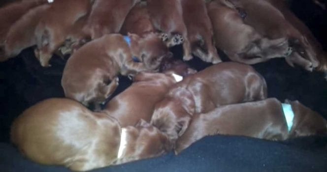 Romy fick 15 friska valpar. 10 tjejer och 5 killar. Det är ovanligt många för hennes ras, och som tur är mådde alla bra!