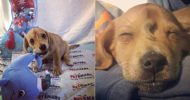 Mitt mellan ögonen sitter nämligen en liten svans som gett valpen smeknamnet ”enhörningsvalpen”.