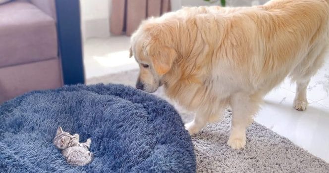 Att kattungen ”ockuperar” hundsängen som det står i beskrivningen i klippet verkar inte bekomma den här coola hunden det minsta. Detta är verkligen ett härligt klipp som alla borde se.