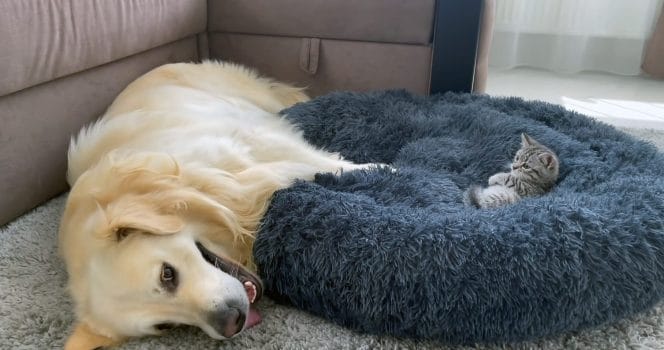 Denna golden retriever och en liten kattunge hade en rolig och bedårande ”kamp” om en hundsäng, som fångades i en viral video med över 37 miljoner visningar.