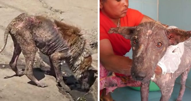 Hemlös hund lider av skabb över hela kroppen – får komma till ett djurhem där förvandlingen blir total