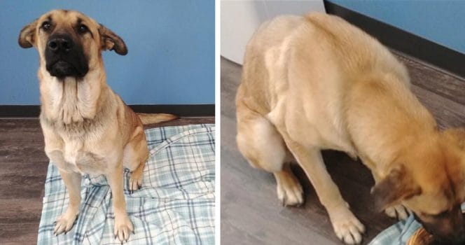 Hemlös hund skyddar något under sin varma kropp – när det rör på sig ser djurvännen att det inte är valpar