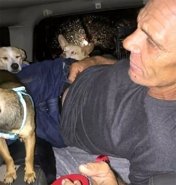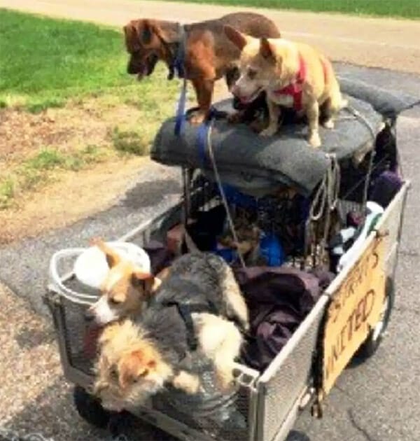 Han trampade sig fram över motorvägen med hundarna bak på kärran när en kvinna vid namn Alicia såg mannen och att han verkade utmattad så hon stannade till för att fråga hur det stod till.