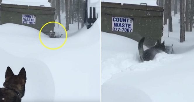 Kanawha, som är en schäfer, är en större hund än sin bästis Knuckles – och har därmed lättare att ta sig fram i djup snö. Med den vetskapen bestämmer sig schäfern att hjälpa sin vän, och tar ett skutt över den höga snövallen.