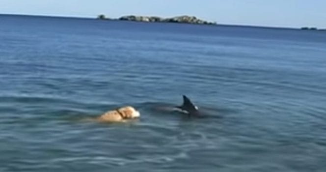 Det var i april 2017 som denna fina Golden retriever var ute och simmade i vattnet. Plötsligt fick han syn på ett annat djur, nämligen en delfin som hade simmat in relativt långt in mot land. Hunden fick syn på delfinen och simmade efter. Nu hade han fått en ny vän.