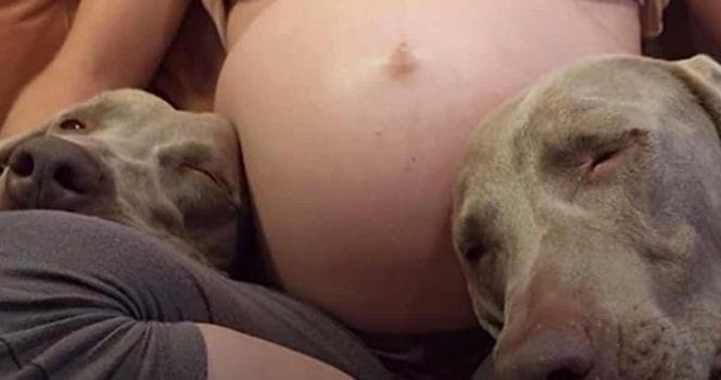 De två hundarna älskade att mysa med mammas växande mage, och vilade ofta sina varma huvuden på mammas bula.