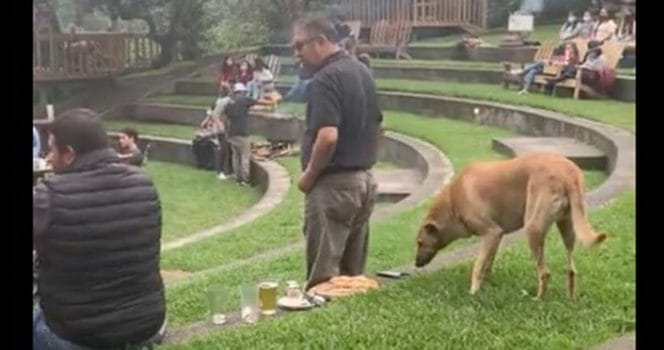 ”Vi satt och lyssnade på banden som spelade på scenen, när vi såg en hund komma upp för att sniffa på maten från en man framför oss. Eftersom det inte finns några bord på läktaren mot scenen, hade mannen lämnat sin mat på läktaren. Jag tog snabbt upp telefonen för att filma och just i det ögonblicket kom hunden närmare och tog tag i pizzan från mannen. Vi i kompisgänget skrattade mycket och mannen insåg vad som hade hänt, men han brydde sig inte. Hunden stannade några meter bort, åt sin pizza och mannen skrattade bara och lät honom äta i fred!”, skriver personen som filmat klippet i staden Sacatepequez, Guatemala.