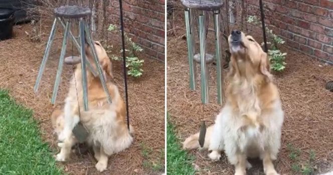 Förra året blev den här hunden mycket uppmärksammad på Facebook. Då lade husse eller matte ut ett videoklipp när vovven bestämde sig för att försöka sjunga med till tonerna av ett särskilt ”instrument” som många brukar ha i trädgårdarna, nämligen vindspelet.