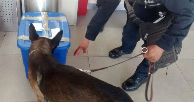 Con apoyo de oficiales caninos, integrantes de la División de Fuerzas Federales detectaron una caja de plástico con…