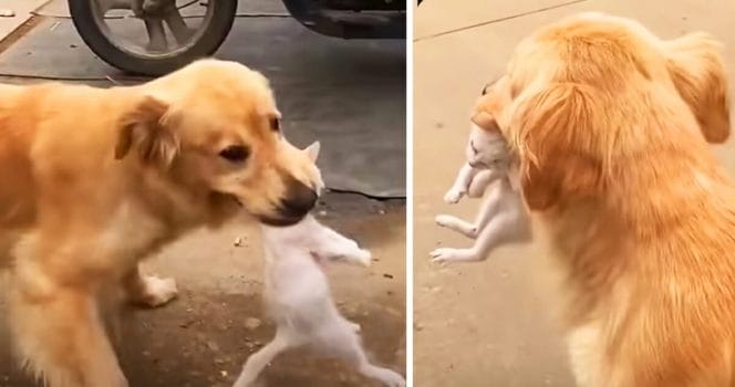 Det var när den här Golden Retrievern var ute på promenad som hon fick upp ögonen för den lilla varelsen. En kattunge med tilltufsad vit päls vandrade omkring, ensam på gatorna. Det visade sig att det var en gatukatt, utan hem och utan kärlek i sitt liv.